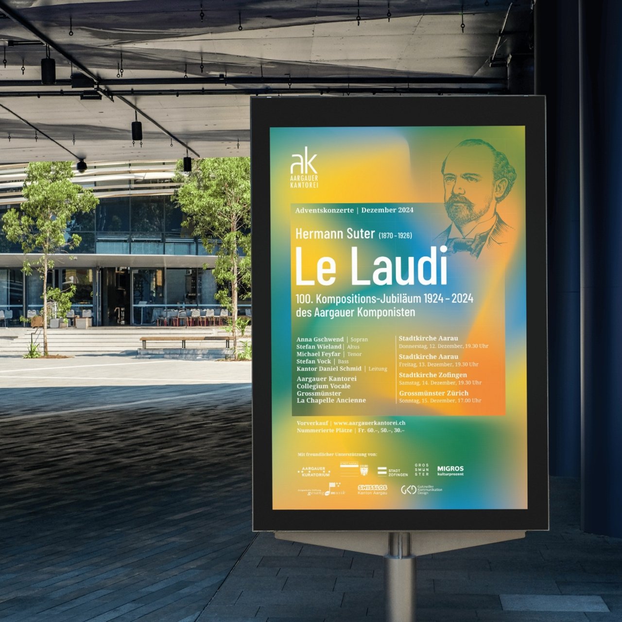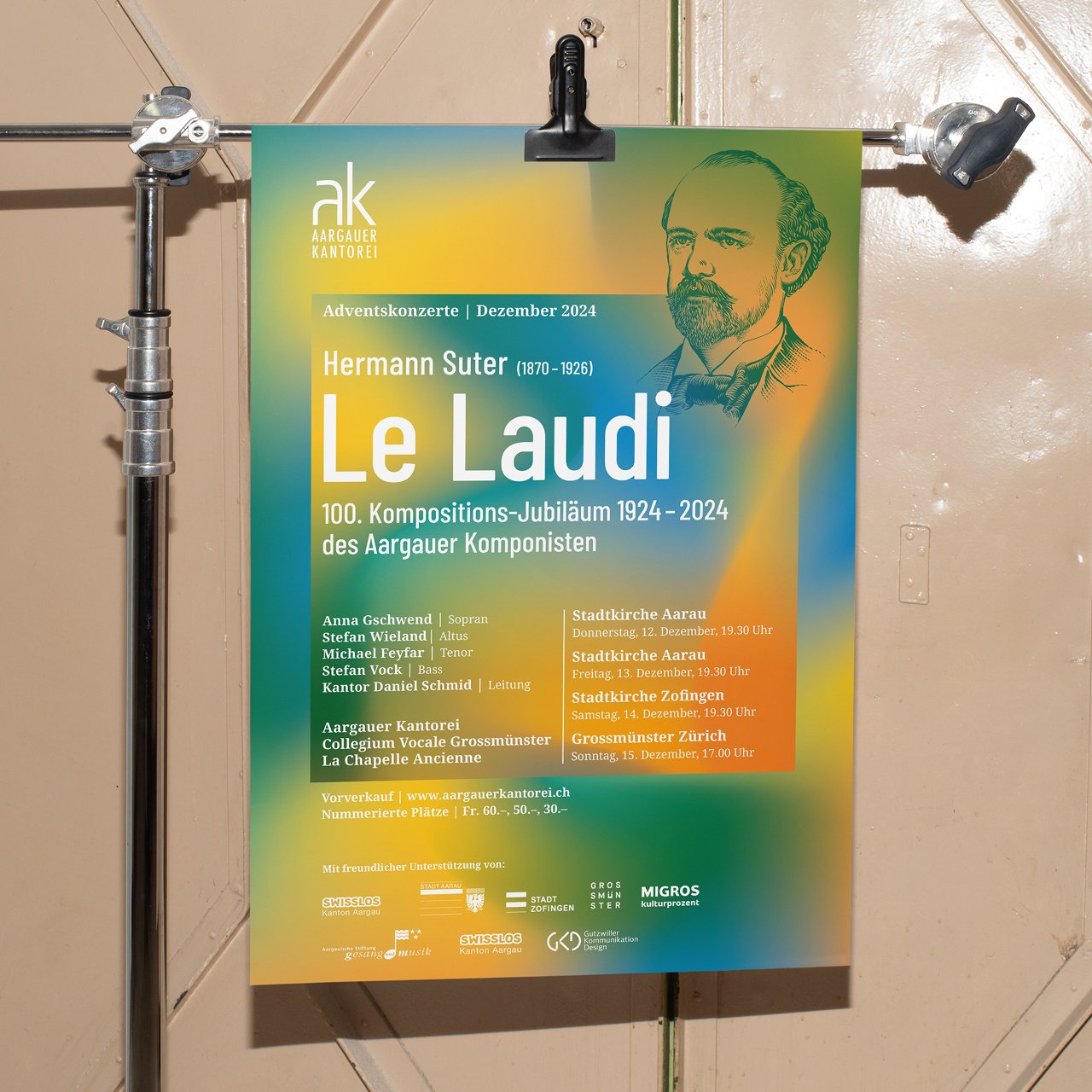 Das Adventskonzert der Aargauer Kantorei bildet den feierlichen Abschluss des musikalischen Jahres. Dieses Jahr erstrahlt «Le Laudi» von Hermann Suter in warmen, goldenen Farben, die die emotionale Tiefe und den festlichen Charakter des Werks eindrucksvoll unterstreichen. Passend dazu haben wir das visuelle Konzept abgestimmt und Hermann Suter im klassisch illustrativen Stil interpretiert.