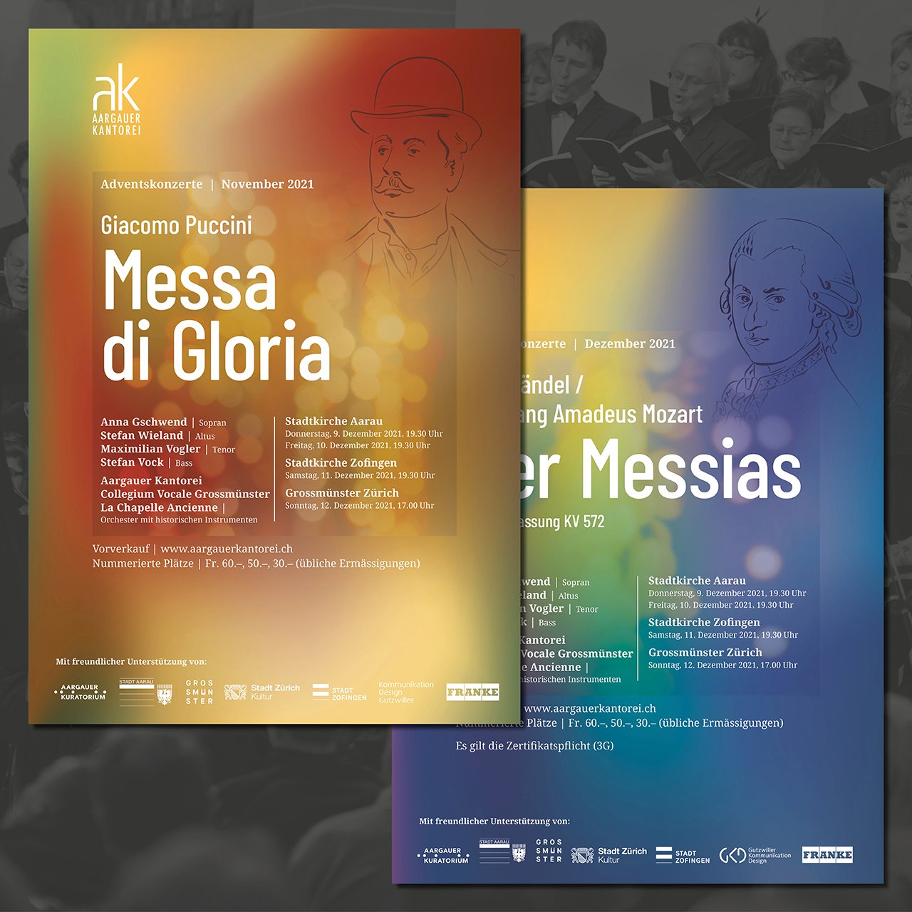 Für die Aargauer Kantorei gestalten wir schon seit fast 10 Jahren die jeweiligen Plakate und Programmhefte der mehrmals im Jahr stattfindenden Konzerte. Wegen den Coronamassnahmen musste auch die Kantorei pausieren. Jetzt, wo wieder Konzerte mit den nötigen Schutzmassnahmen stattfinden können, haben wir uns gemeinsam für ein leichtes Redesign der laufenden Kampagne entschieden.
