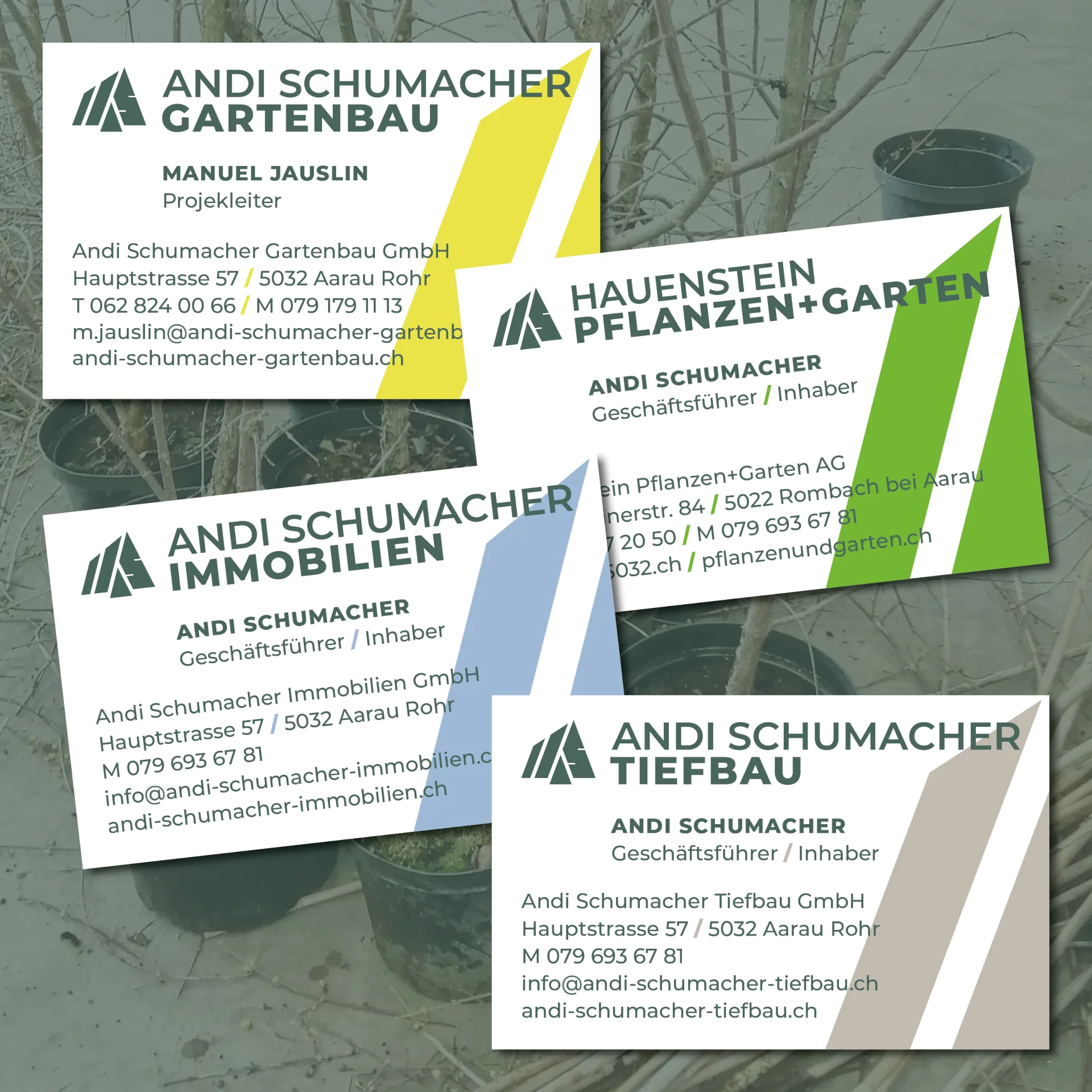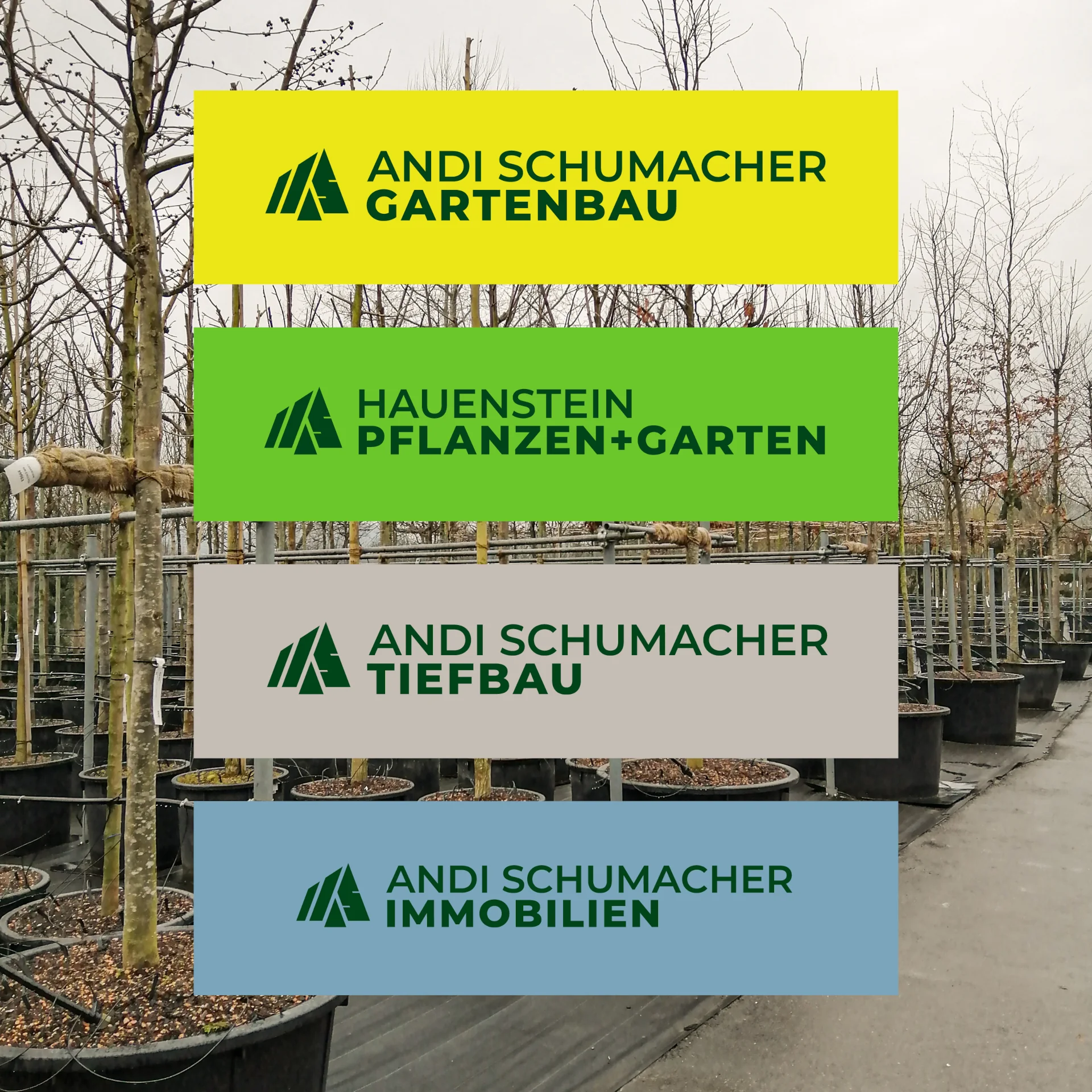 Vier Unternehmen, ein gemeinsames Erscheinungsbild: Für die Firmen von Andi Schumacher: Gartenbau, Pflanzen+Garten, Tiefbau und Immobilie, wurde ein einheitliches Corporate Design entwickelt.