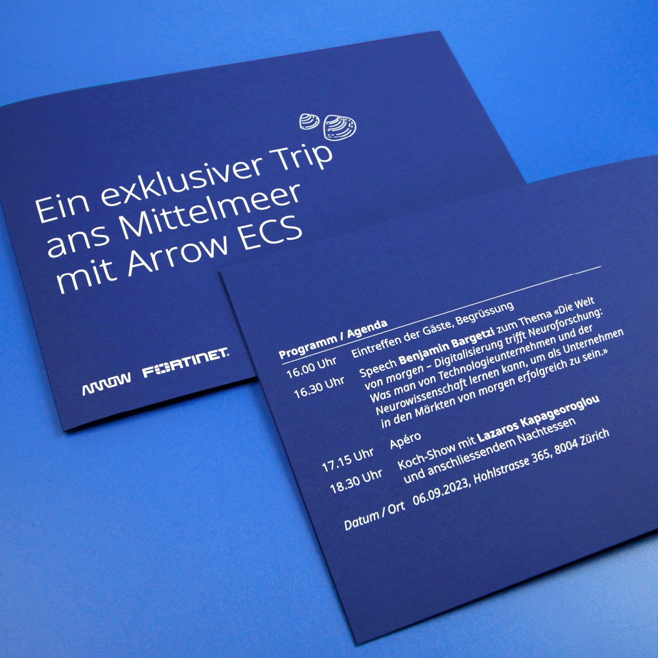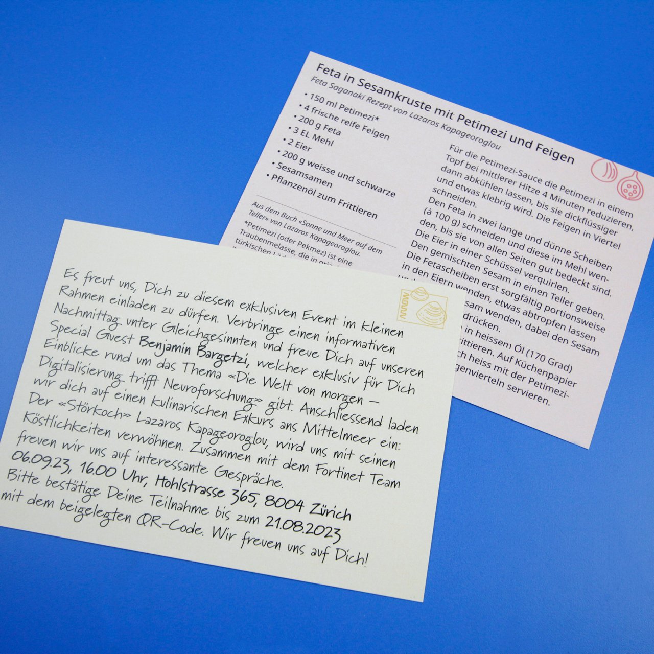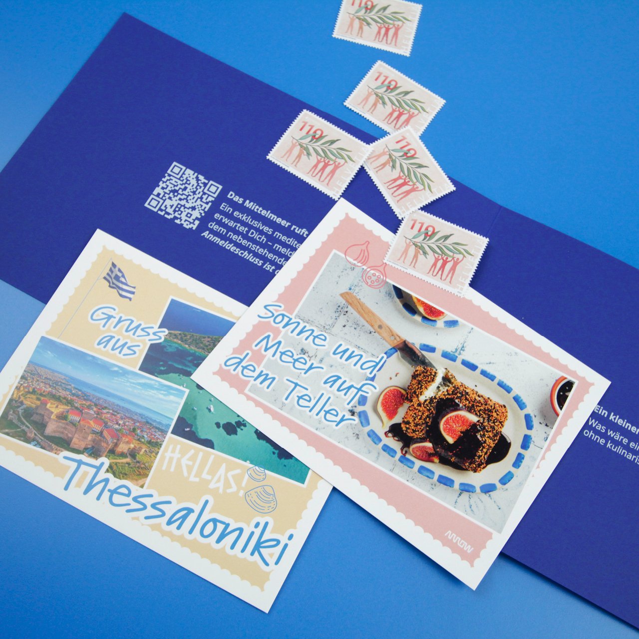 Ein bisschen Guerilla-Feeling war auch dabei, als wir die Einladung für einen VIP-Event neu konzipieren und gestalten konnten. Weil ein geplanter Golfevent leider nicht stattfinden konnte, musste relativ rasch eine neue Idee und Umsetzung gefunden werden. Und weil gutes Essen immer allen schmeckt, wurde daraus ein persönlicher Bekochungsabend mit einem lokalen Starkoch aus Griechenland. Die Einladung nimmt das griechische Inselfeeling auf und lädt zu einer kulinarischen Reise ein. Sandiges Papier und typische Ferienpostkarten mit einfachem Teaser-Rezept versetzen die Empfänger*innen in Ferienmodus und versprechen so einen entspannten Abend mit einem Top-Speaker zur IT-Thematik. Die Anmeldung lief über einen QR-Code auf die entsprechende Anmeldeseite.