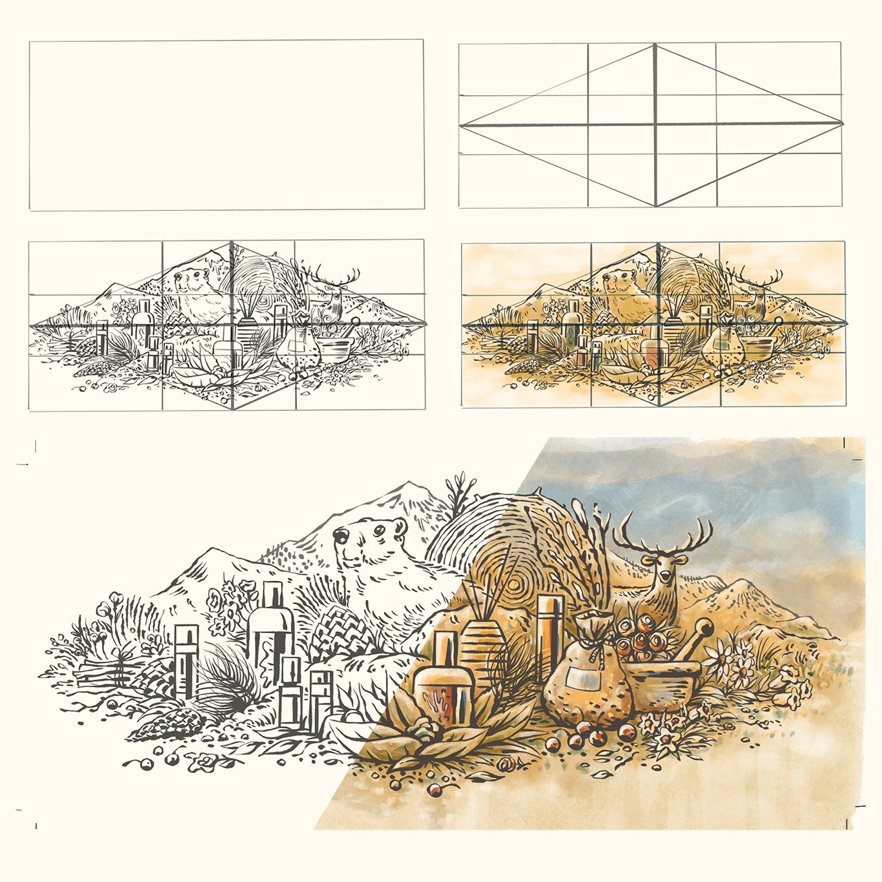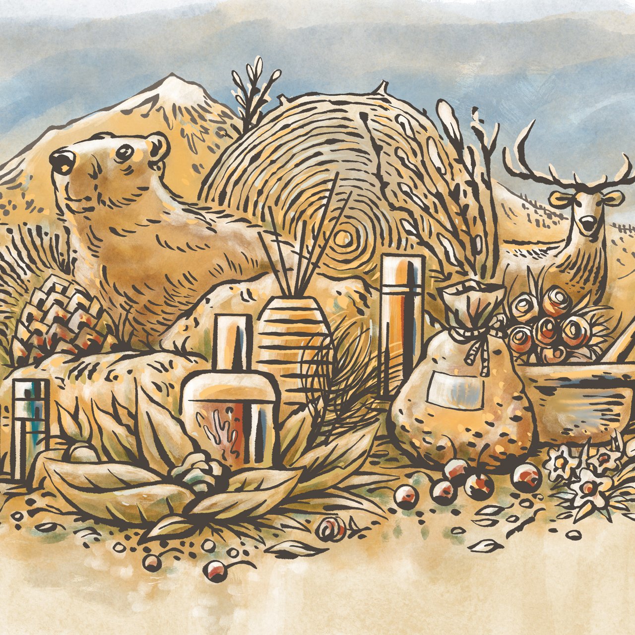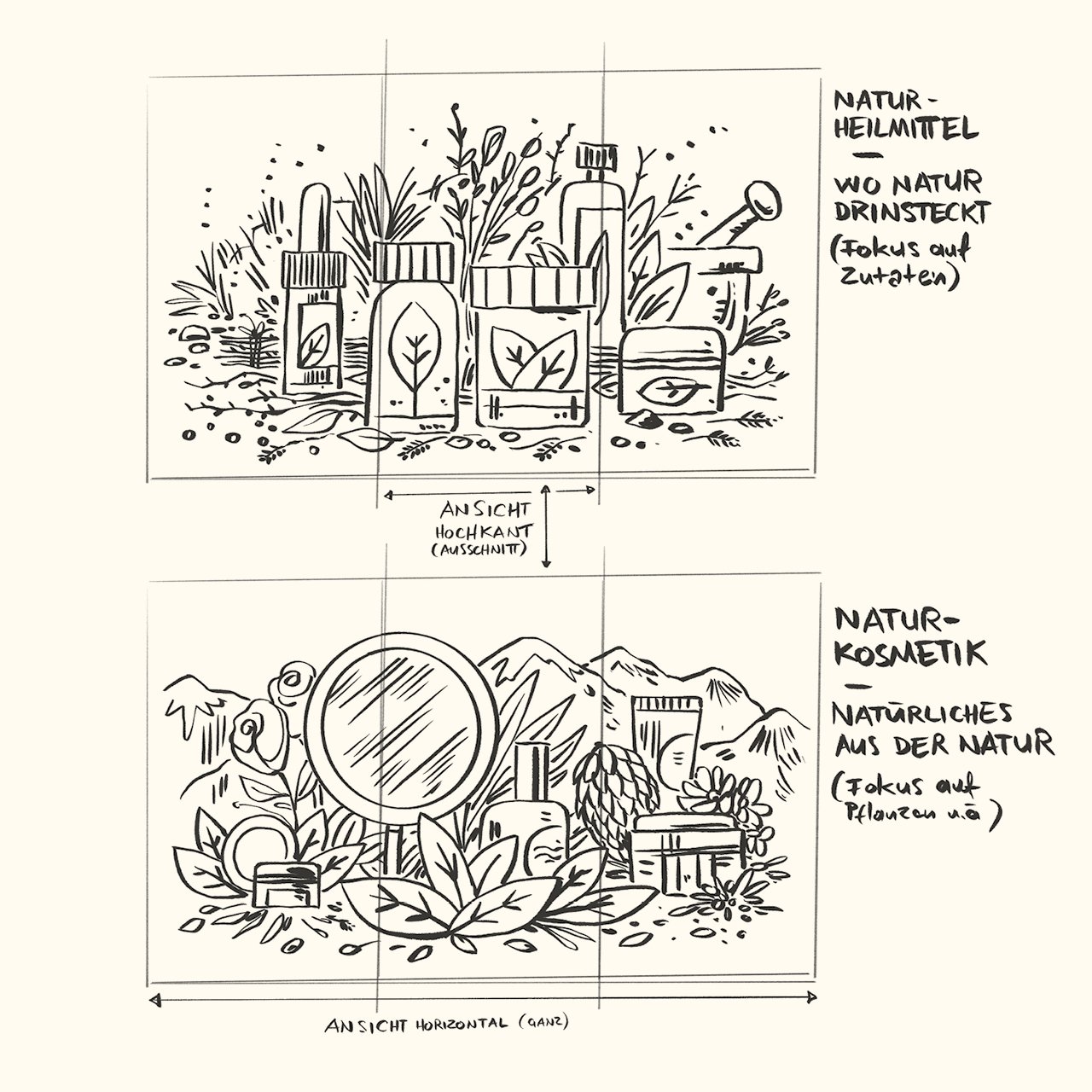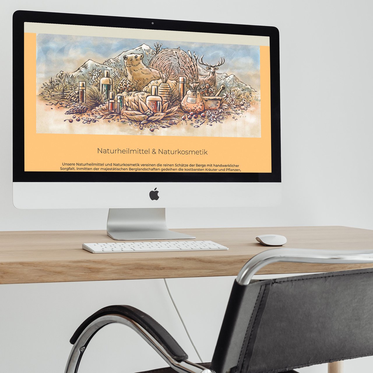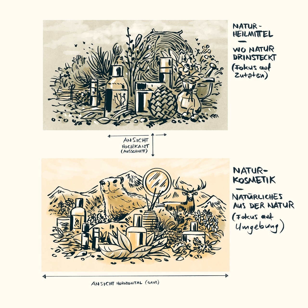 Die Illustration umfasst die vier Grundbereiche des Sortiments (Arve, Alpenrose, Wasser und Tier) und stellt sie als harmonische Einheit in natürlicher Umgebung dar. Dieses KeyVisual wirkt sowohl auf der Website als auch später in gedruckter Form für die Schaufenstergestaltung und mögliche Printsachen. Die Illustration erlaubt es, Dinge miteinander zu kombinieren, die es so zu fotografieren nie möglich gewesen wäre, als auch als Vision und Metapher für das Wirken der Drogaria Stadler zu stehen und so den Menschen einen einzigartigen Eindruck gewähren zu können.