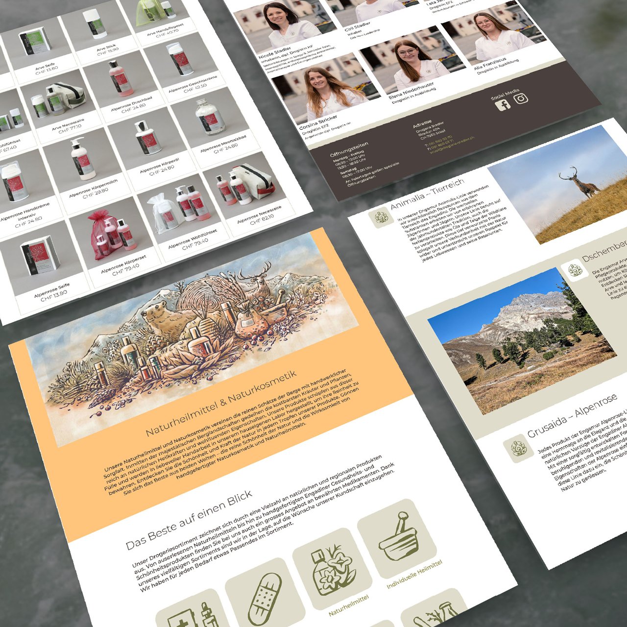Als die Drogaria Mosca von Nicole und Cyril Stalder in die neue Drogaria Stalder übernommen und fortgeführt wurde, haben wir auch die entsprechende Website inkl. Webshop neu konzipiert, fotografiert, gestaltet und extern im CMS Typo3 programmieren lassen. Das Hauptaugenmerk liegt auf den hauseigenen Spezialitäten, die man im neuen Webshop kaufen kann. Visuell stehen die extra dafür erstellten Fotografien aus Scuol und Umgebung als KeyVisual prominent für die Hauptbereiche als auch für spezielle Produktsortimente. Der Aufbau der Website ist einfach verständlich, ein klickbarer und herausfahrender Reiter weist auf spezielle Ereignisse oder Produktlancierungen hin, die Inhalte sind innerhalb der jeweiligen Bereiche auf einer Seite zusammengefasst. Die Farbdefinition wurde aufgrund der Produktbereiche und der bereits bestehenden Produktetiketten neu definiert und die Farben agieren auf der Website als Orientierungshilfe als auch als wichtige, visuelle Gestaltungselemente.