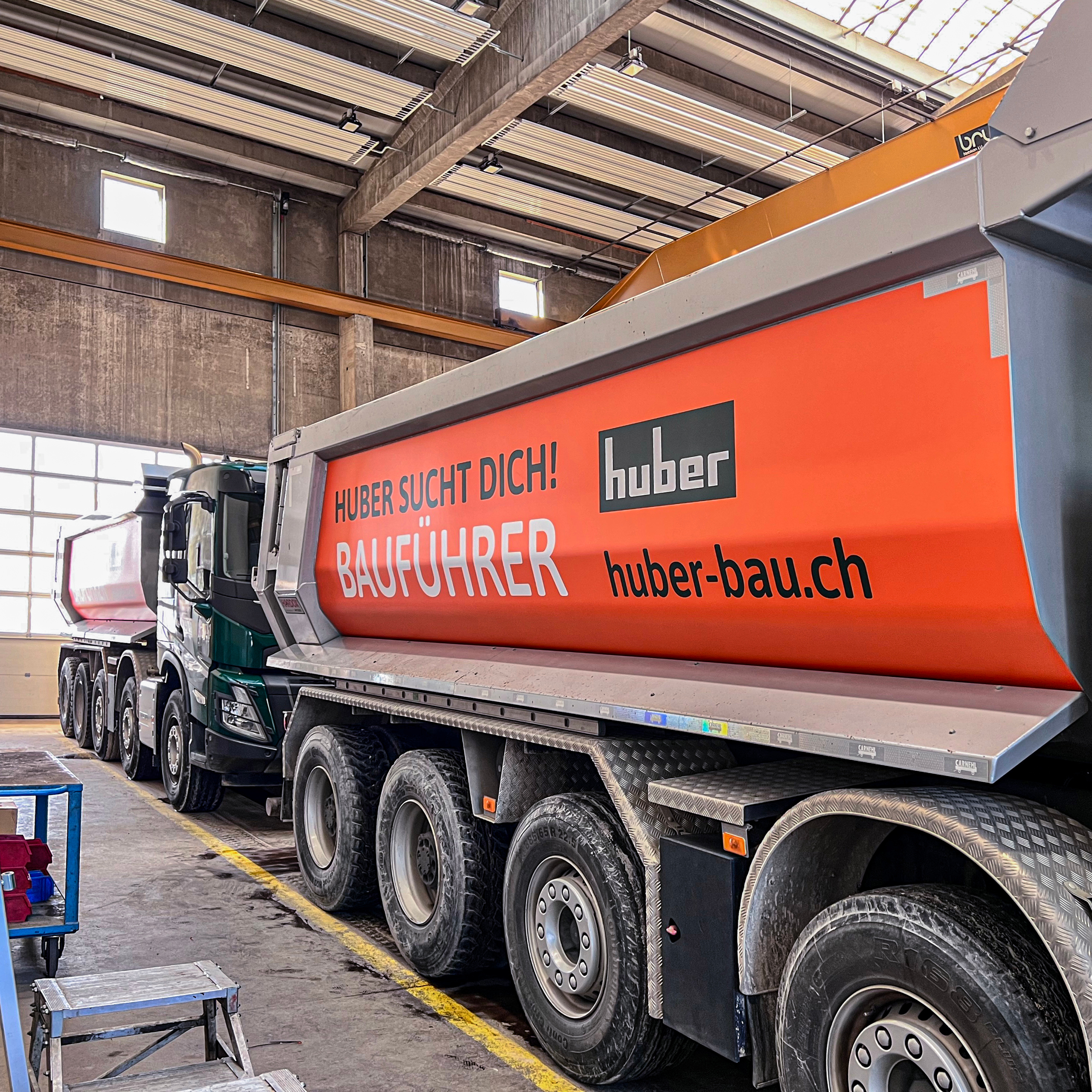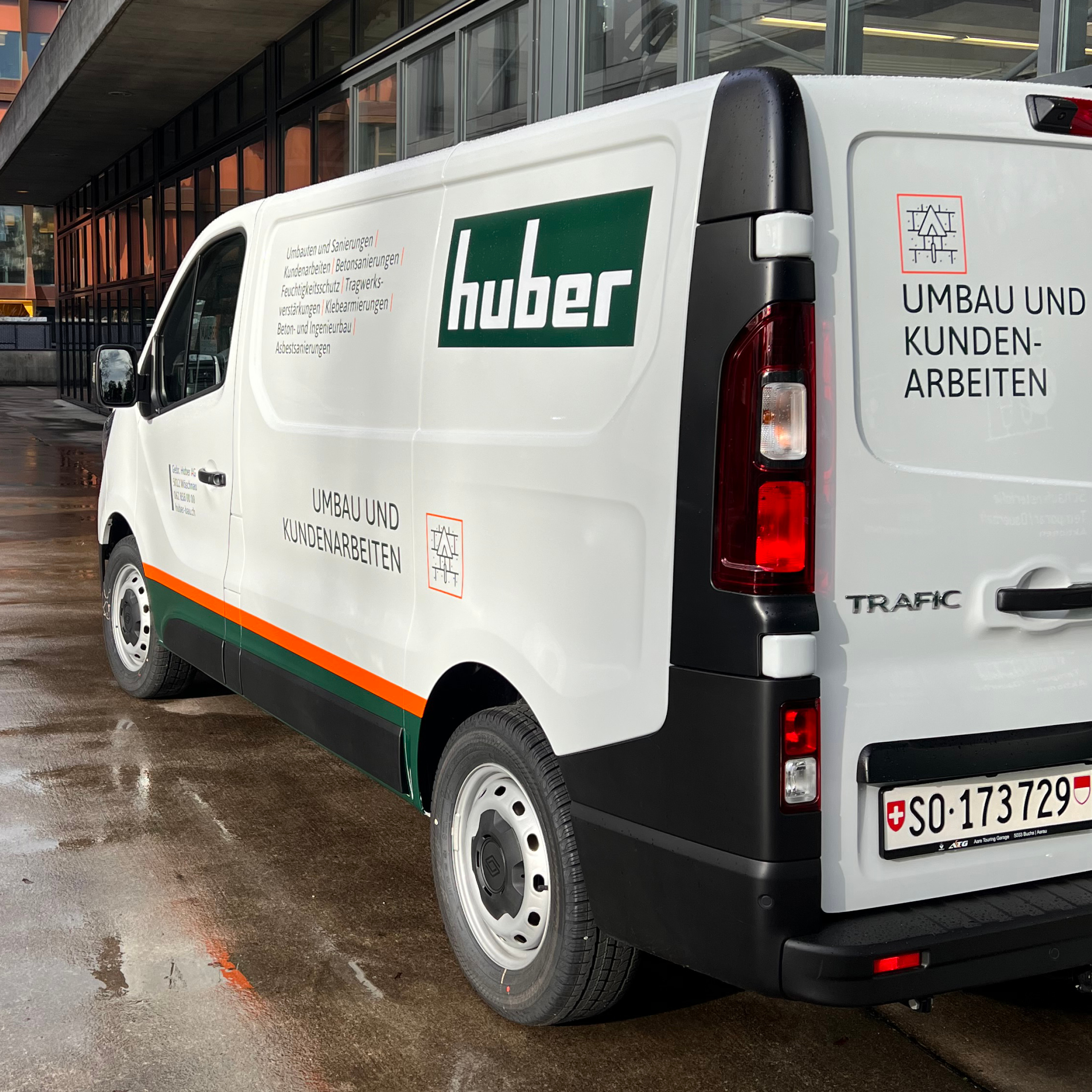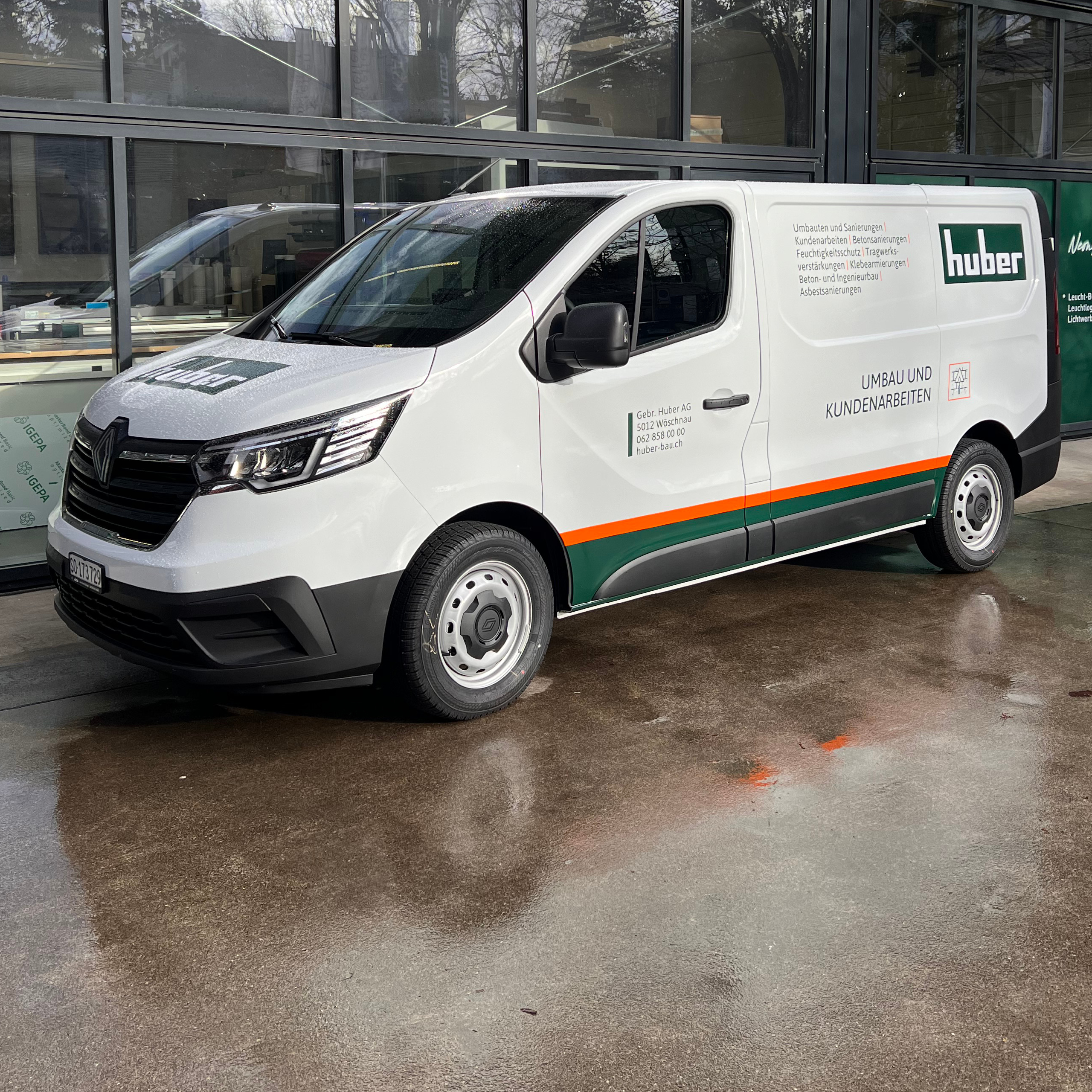 Gleich zwei Fahrzeuge konnten wir wieder für die Gebr. Huber AG (Rück- und Tiefbau) beschriften: Zum einen ist es der Transporter für Umbau und Kundenarbeiten, der im klassischen Corporate Design gestaltet wurde.