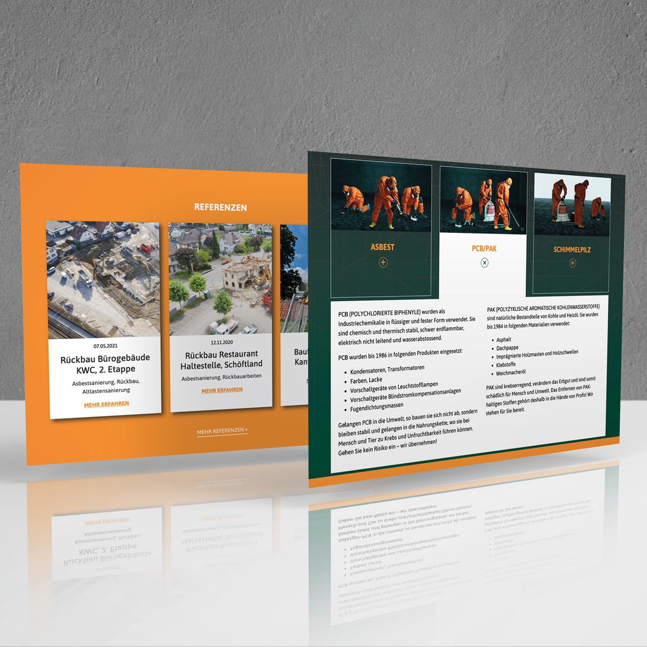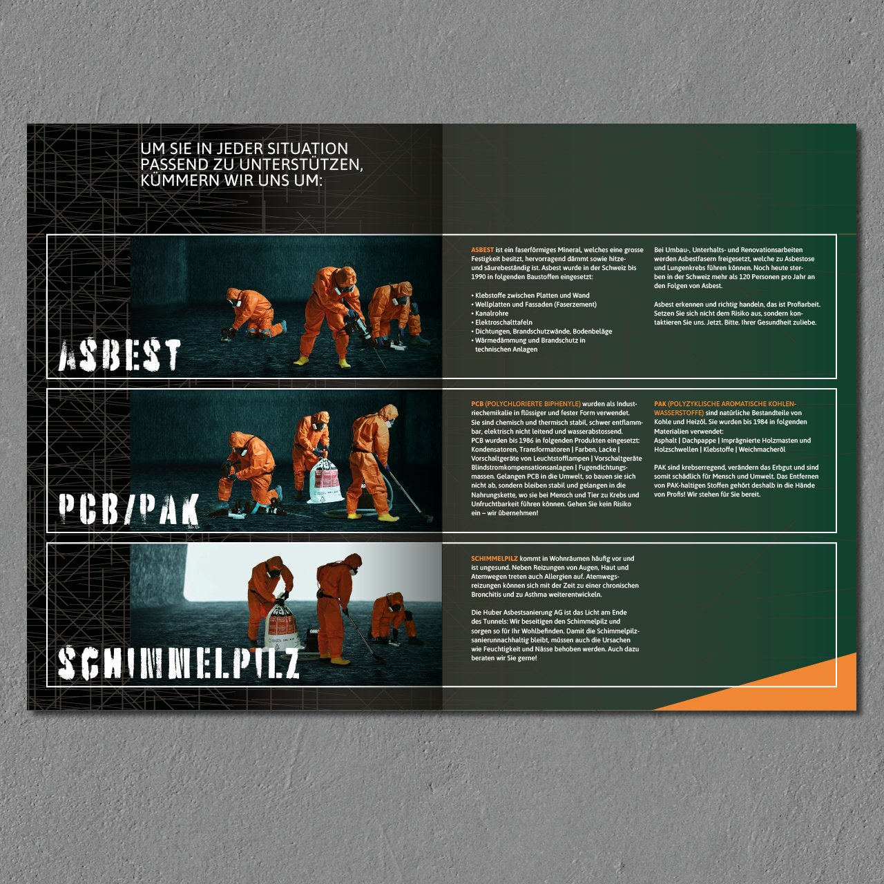 Wir durften den kompletten Auftritt inkl. eines erweiterten Logos gestalten. Ausschlaggebend war eine einfach gehaltene Website inkl. Flyer. Ein eigens konzipiertes Bildkonzept inkl. Fotoshooting und erweitertem Erscheinungsbild gibt der Huber Asbestsanierung AG ein eigenes und starkes Markenbild, welches die Firma unverwechselbar macht.