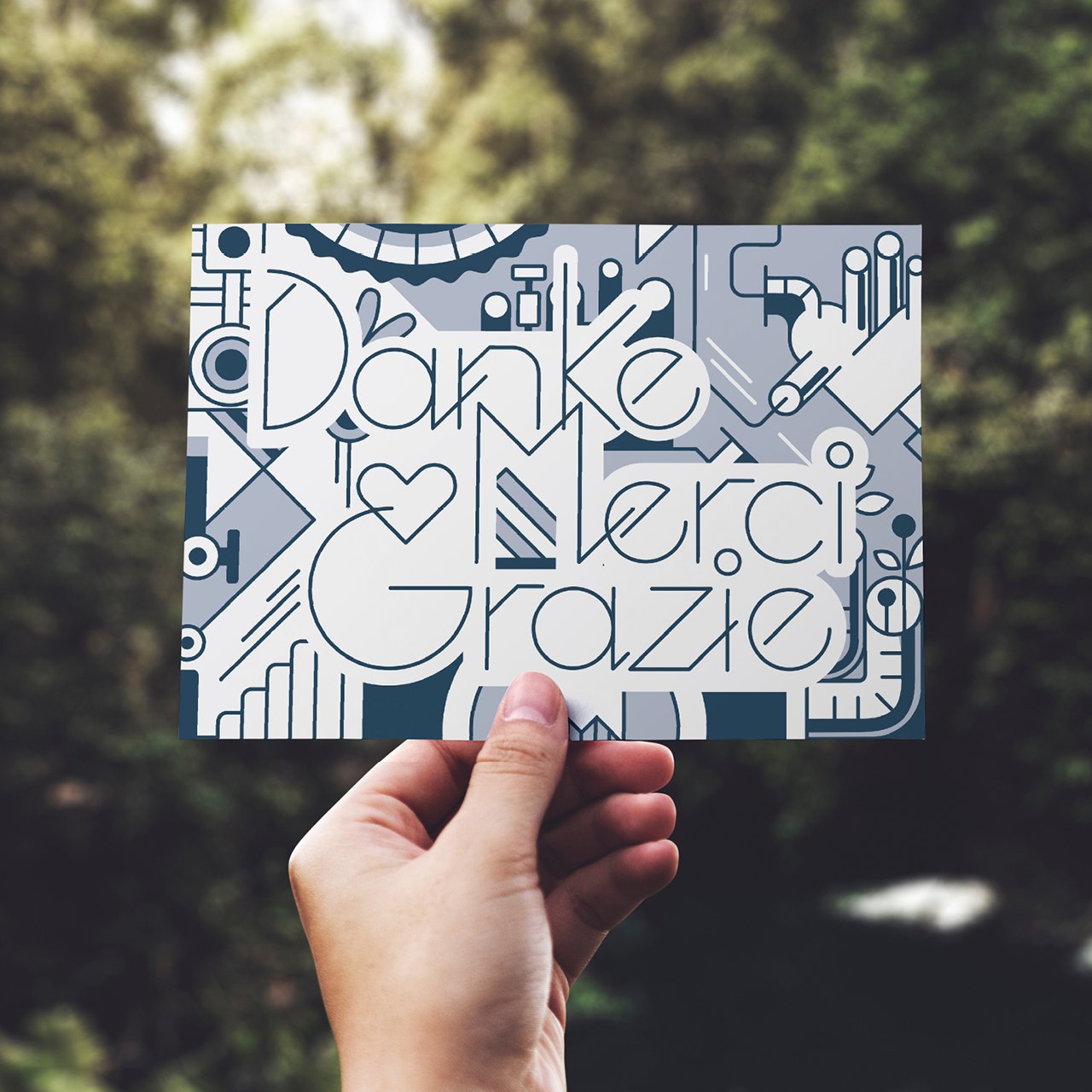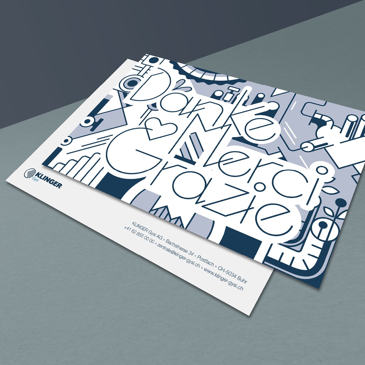 Was mit dem Entwurf für ein grosses Wandbild begann, fand so Anklang, dass KLINGER Gysi die Illustration nun auch für die tägliche Kommunikation nutzen möchte. Und ehrlich gesagt, hatten wir das auch so schon von Anfang an im Hinterkopf. Darum haben wir die Illustration für das Wandbild so aufgebaut, dass man Elemente daraus – je nach Nutzungszweck –entfernen, ergänzen und verändern konnte. So geschehen für diese Dankeskarte, welche typografisch die Formensprache der ursprünglichen Illustration aufnimmt. So fügen sich die Worte in den Bildstil organisch ein und machen aus einer simplen Dankeskarte ein sympathisch markantes Kommunikationsmittel.