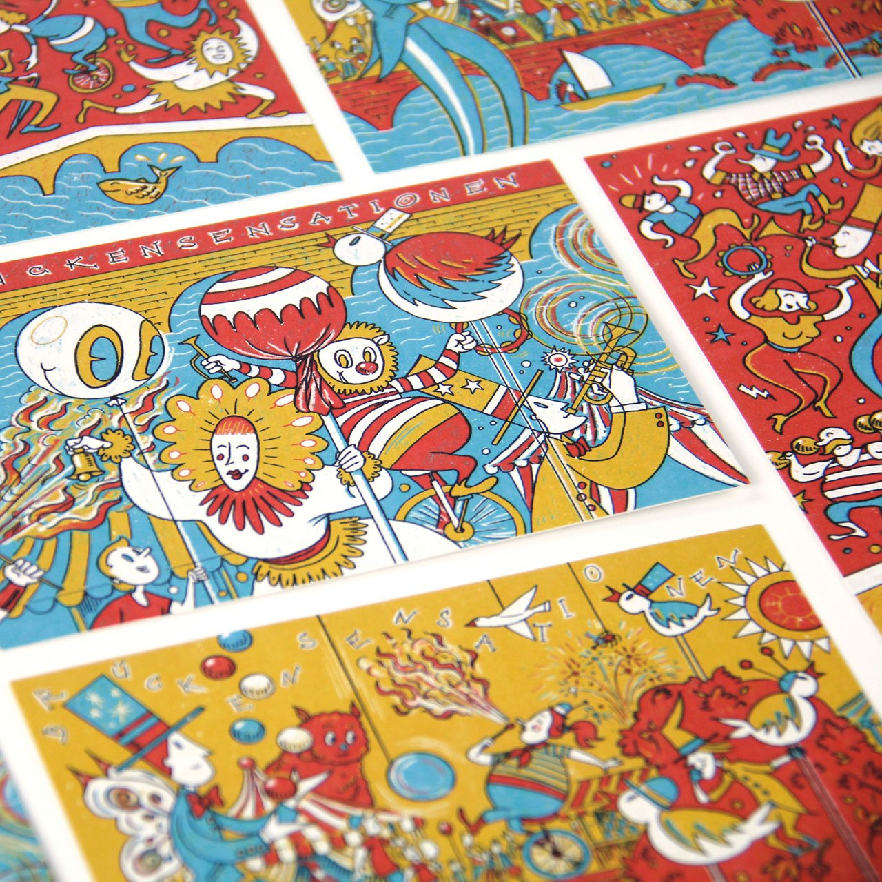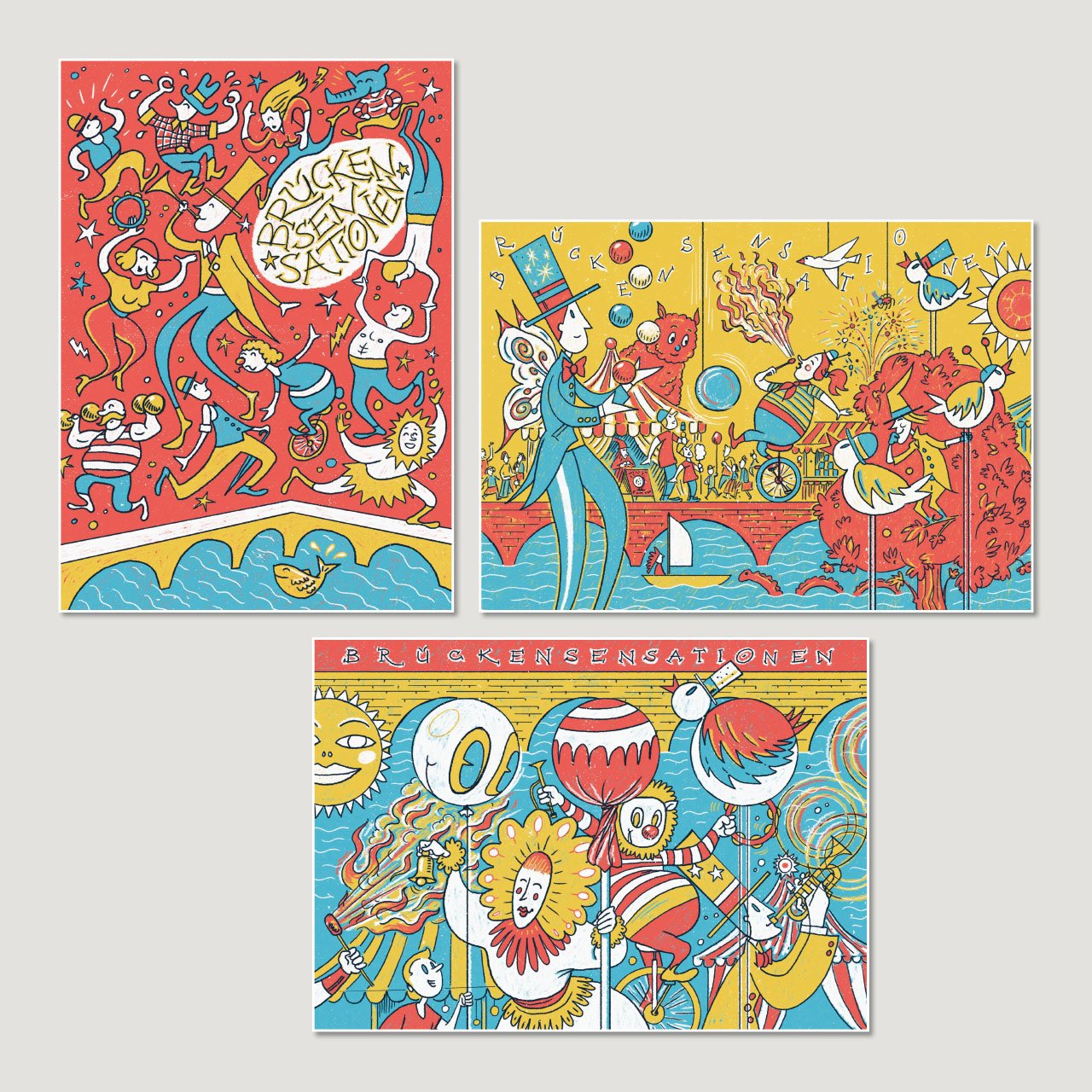 Jedes Jahr veranstaltet das Kulturbüro Rheinfelden das dreitägige Gauklerfestival namens «Brückensensationen». 2016 durften wir erstmals drei Postkarten-Sujets illustrieren und produzieren lassen, die dann am Anlass selbst verteilt wurden. Das Ergebnis hat der Kundin so gut gefallen, dass sie die Postkarten-Sujets sogar vor Ort an eine Hauswand projizieren liess.