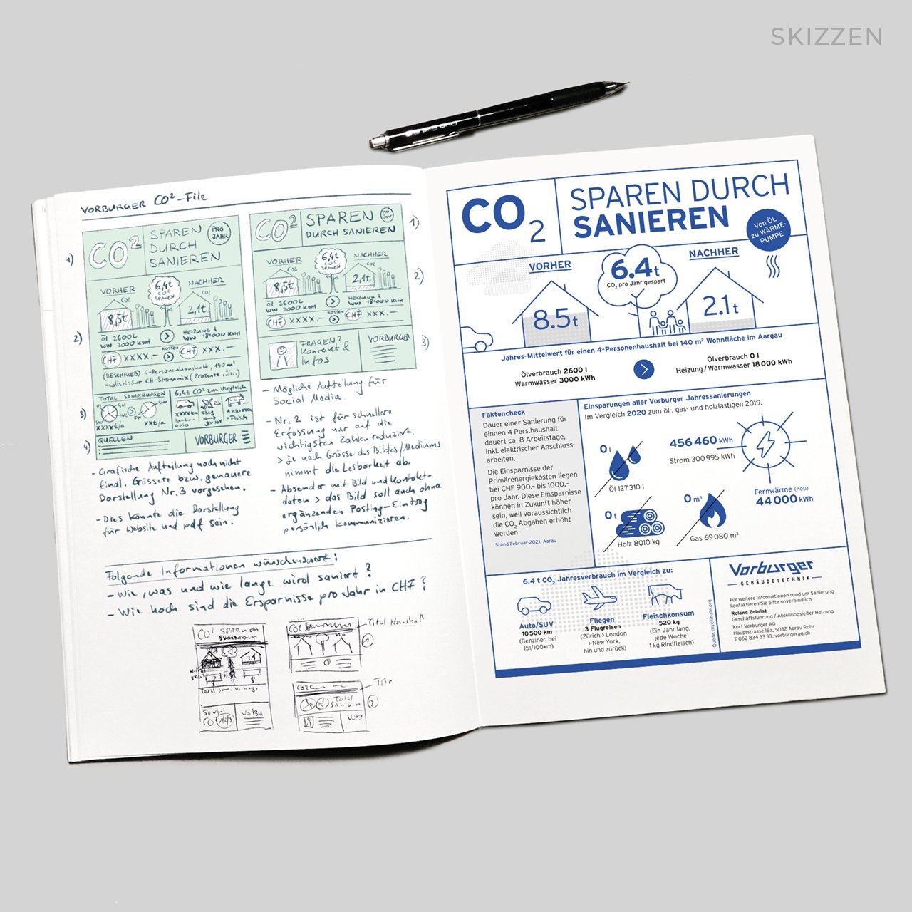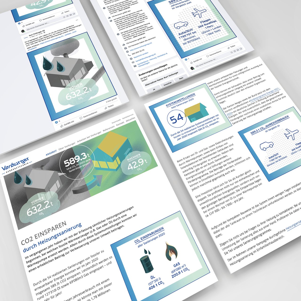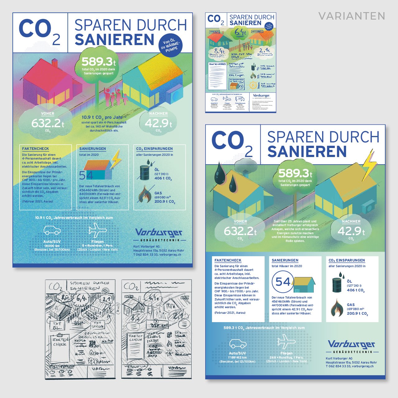 Um diesen Mehrwert sichtbar zu machen, durften wir eine frei adaptierbare, illustrierte Zusammenfassung für Print und Online konzipieren und umsetzen. Diese zeigt im Fokus die CO2-Gesamtersparnis durch alle Sanierungen im Jahr 2020.