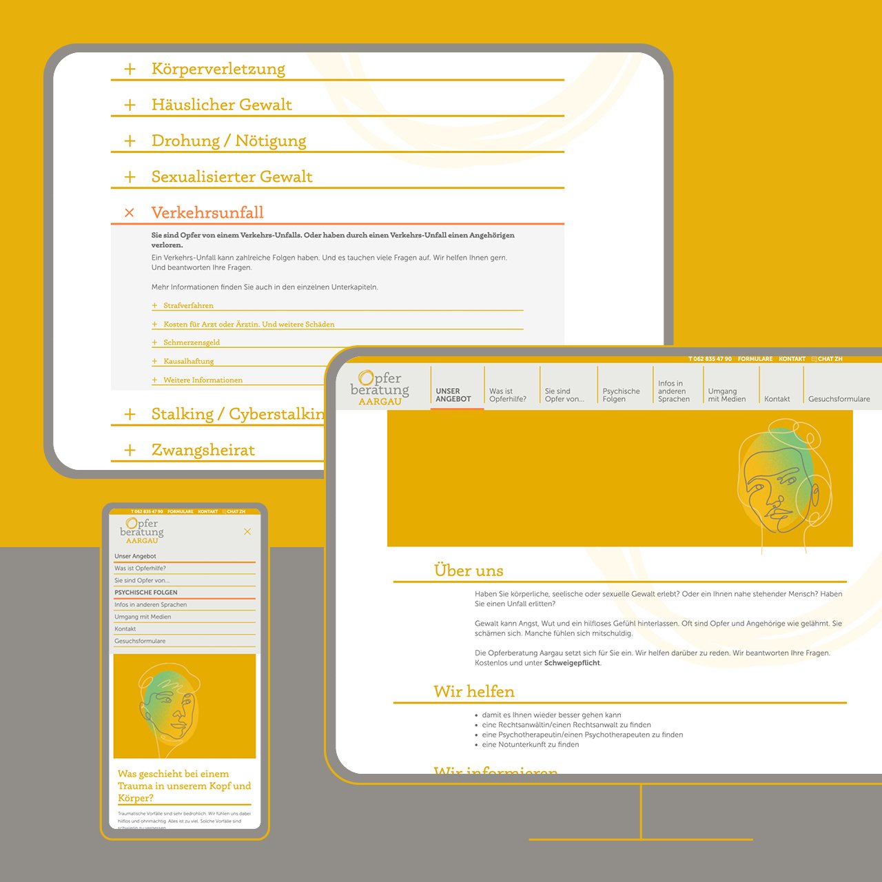 Aus der Kooperation mit Solothurn entstanden (Beratungsstelle Opferhilfe Aargau Solothurn), agieren die beiden Kantone in der Opferhilfe seit 2021 autark. Deshalb wurden wir mit der Gestaltung des neuen Erscheinungsbildes und der Website für die Opferberatung Aargau betraut. Die Beratungsstelle ist die einzige im Aargau, es gibt keine privaten Anbieter. Die Ausgestaltung betraf das neue Corporate Design sowie die Implementierung der bestehenden Inhalte in einen neuen und zeitgemässen Webauftritt.