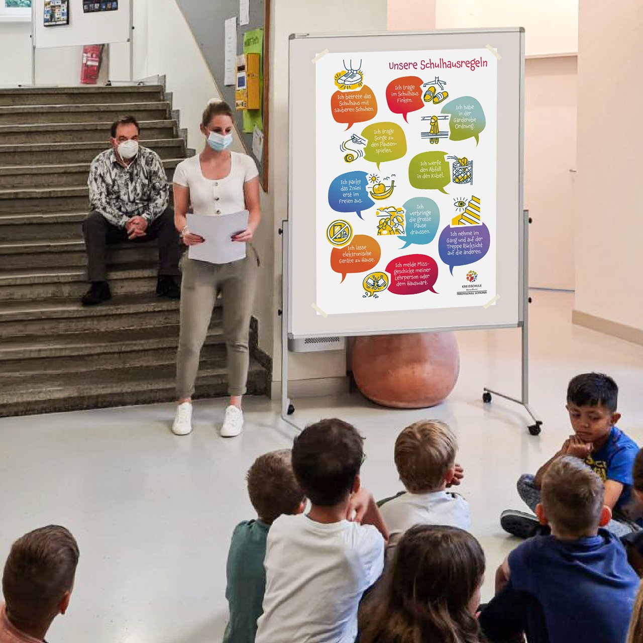 Bekanntlich übt sich früh, wer Meister:in werden will. So werden jetzt auch die Kinder der Primarschule Schachen in die neue Hausordnung eingeübt, damit das bunte Miteinander für alle klar verständlich wird.