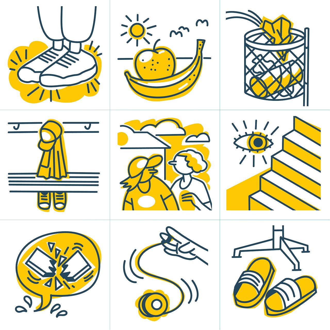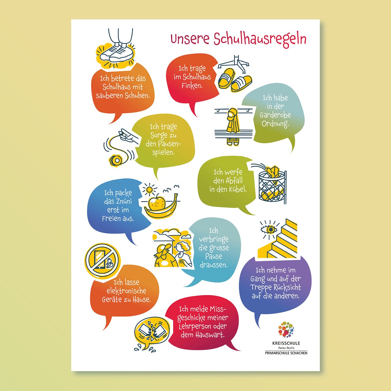Wir durften dies in einer Plakatserie illustrativ und kindergerecht umsetzen. Weil das Geschriebene noch nicht für alle Kinder lesbar ist, dienen die Piktogramme als Erklärbild ebenso wie als Erinnerungsanker.
