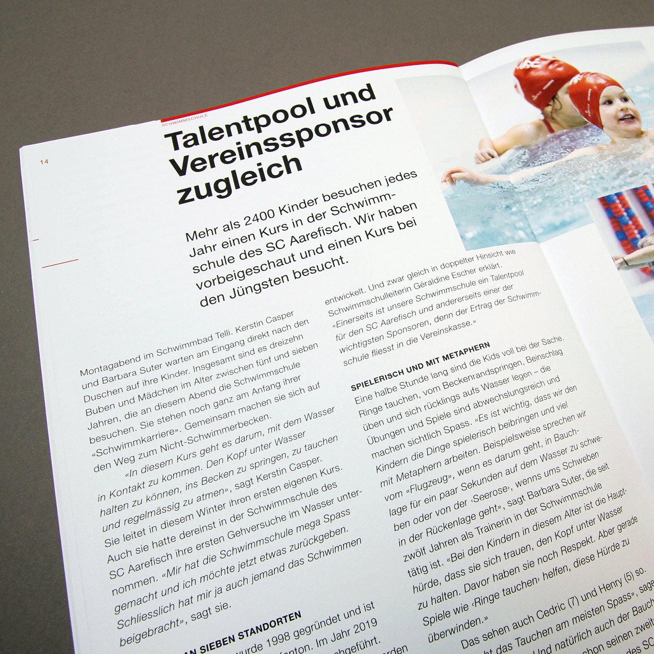 Der Schwimmclub Aarefisch zählt heute zu den führenden Nachwuchsstützpunkten der Schweiz und betreibt auch die grösste qualitätszertifizierte Schwimmschule der Region. Viele gute Gründe, um diese Erfolge auch in einem eigenen Magazin zu zeigen und zu feiern! Wir durften das Konzept und die Gestaltung für diese erste Ausgabe beitragen.
