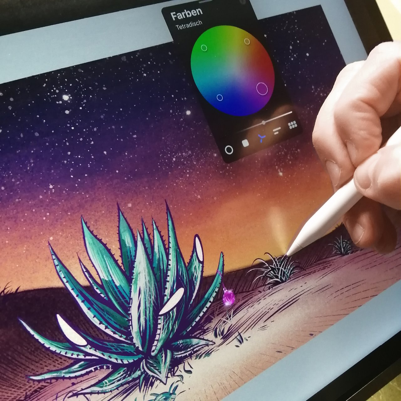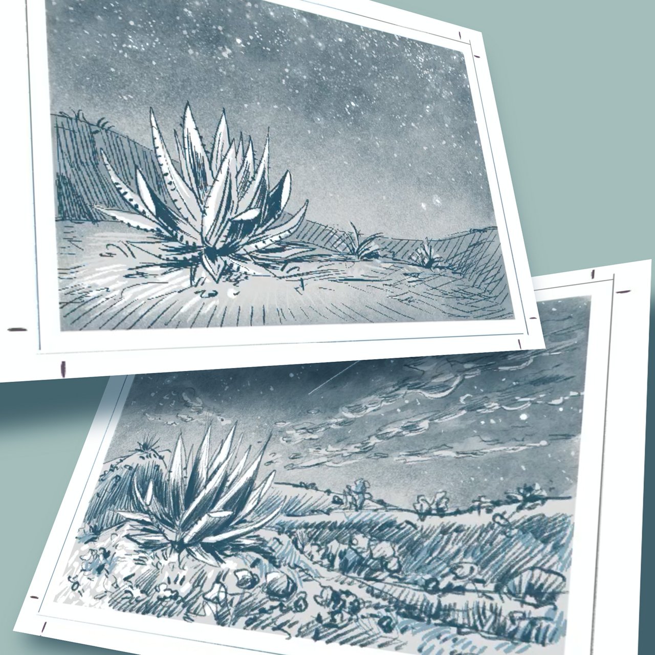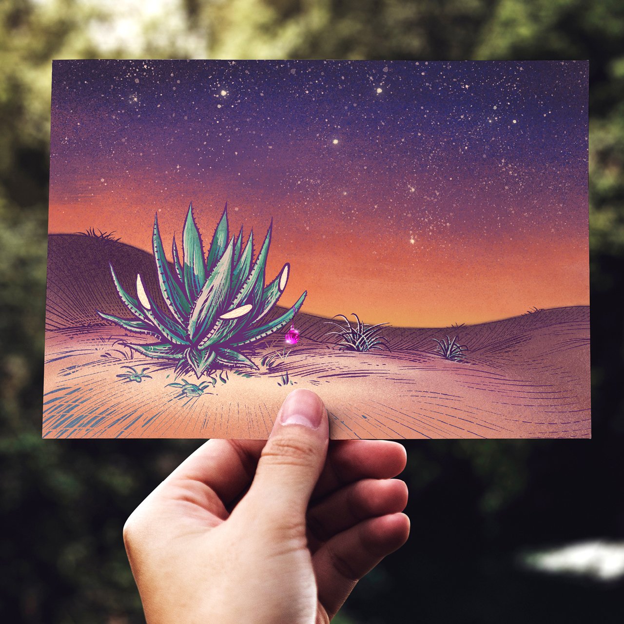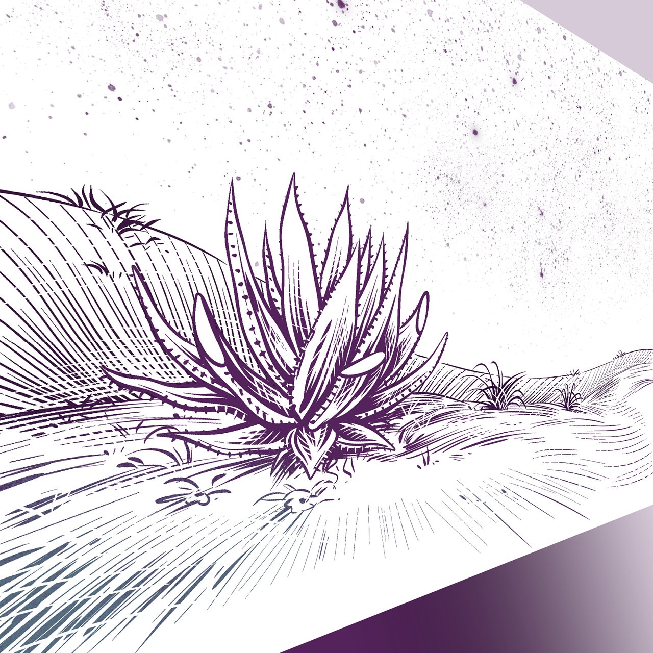 Die Aloe Vera Pflanze in einer wüstenähnlichen Landschaft war der ausdrückliche Wunsch von Social Input für diese Illustration der Neujahrskarte und steht symbolisch für ein ganzjähriges Gedeihen unter zum Teil schwierigen Bedingungen.