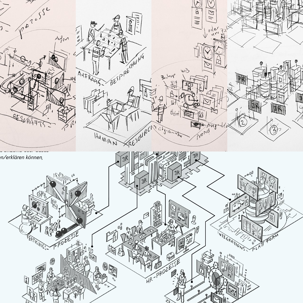 Diese Art der Illustration kann komplexe Zusammenhänge verständlich darstellen und bleibt in der Entwicklung dieser auch editier- und anpassbar.