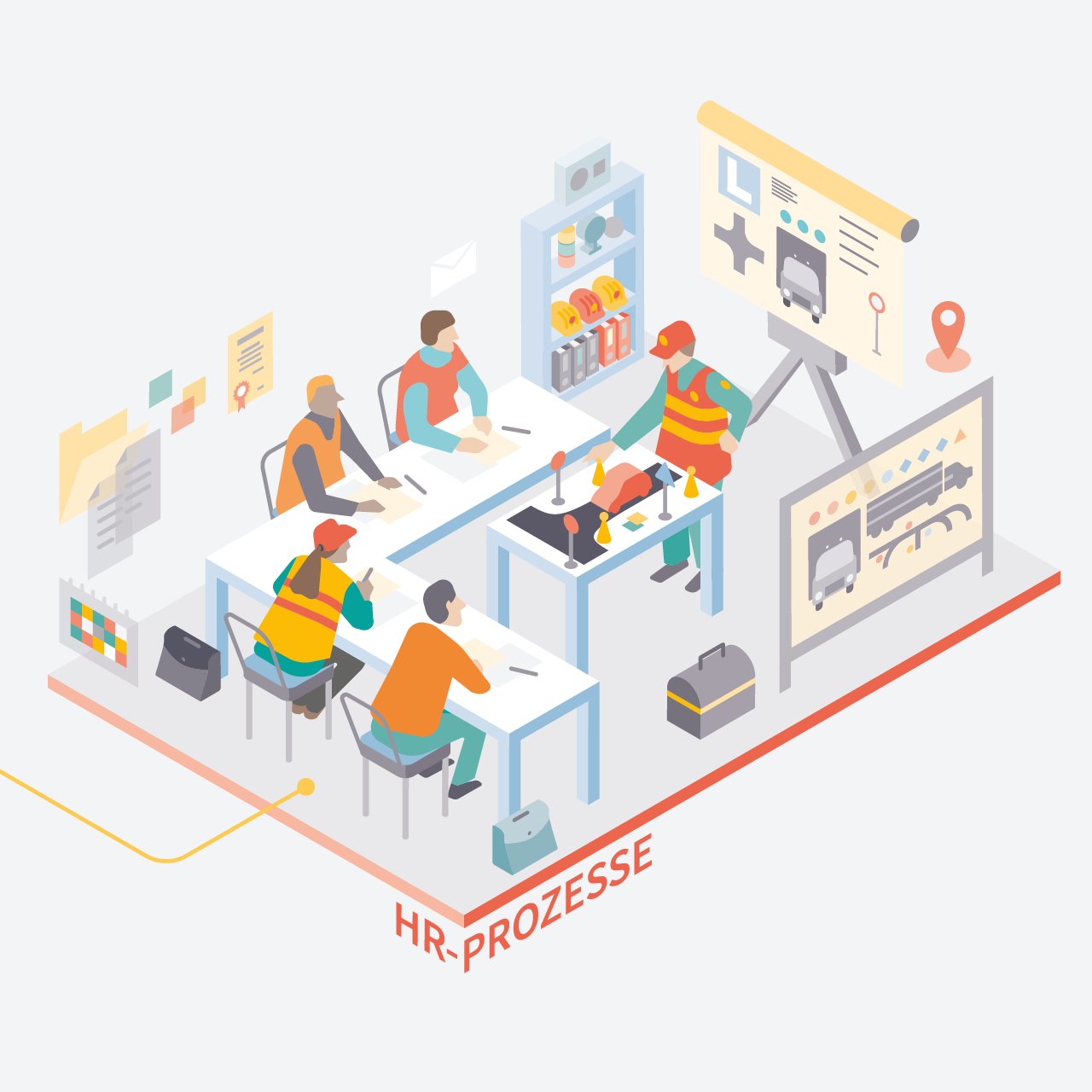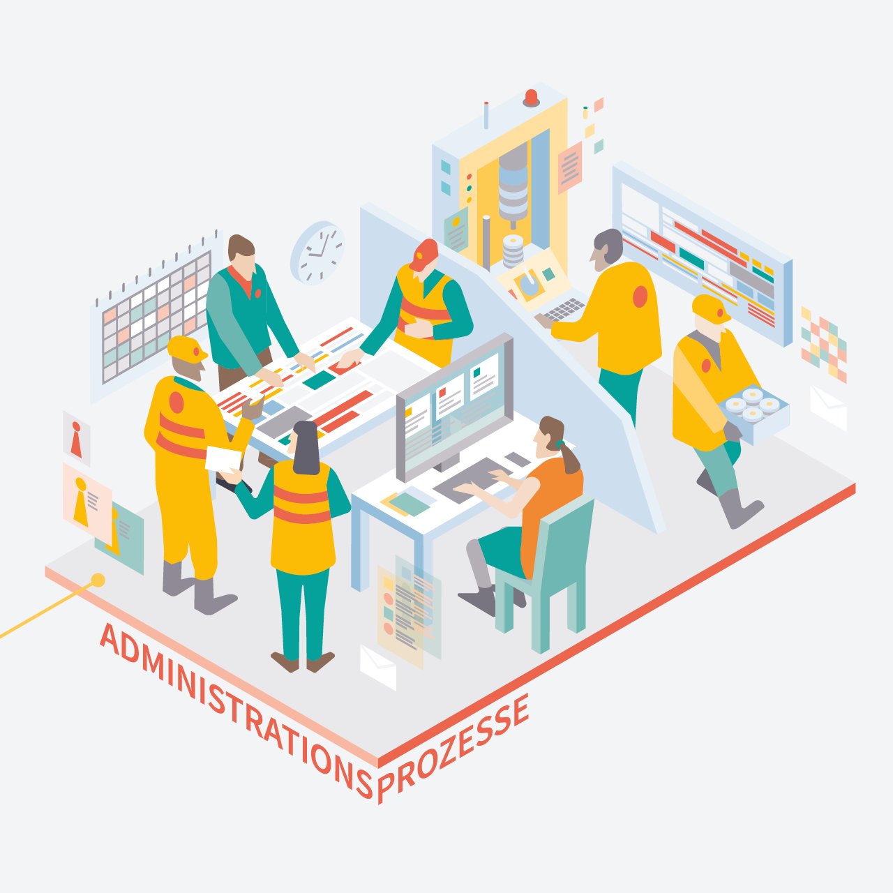 Die wichtigsten fünf Aufgaben wurden vereinfacht dargestellt und fügen sich nahtlos in die bereits bestehende Bildwelt mit ein. Eine längere Entwurfs- und Skizzenphase ging der finalen Visualisierung voraus, weil die Thematik nicht ein Thema, sondern ganz viele Bereiche abbildet und verständlich macht.