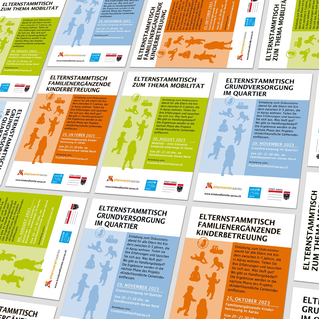Neueltern werden – nebst Kind – ebenso mit Sachen konfrontiert, die man früher ohne Kind so nicht auf dem Radar hatte. Diese haben direkt und indirekt mit dem Kind, den Eltern und Dritten zu tun, wie z.B. Kinderwagengerechte Wege, nahe und einfache Einkaufsmöglichkeiten, Betreuungsmöglichkeiten in der Familie und/oder der Krippe uva. Zu diesem Zweck hat die Stadt Aarau den Elternstammtisch ins Leben gerufen, wo sich Eltern von Kindern zwischen 0 und 5 Jahren zu diversen Themen austauschen und informieren können. Zu diesem Zweck konnten wir einen Infoflyer gestalten, der drei unterschiedliche Bereiche thematisiert und sich der Einfachheit wegen nur in den Farben unterscheidet.