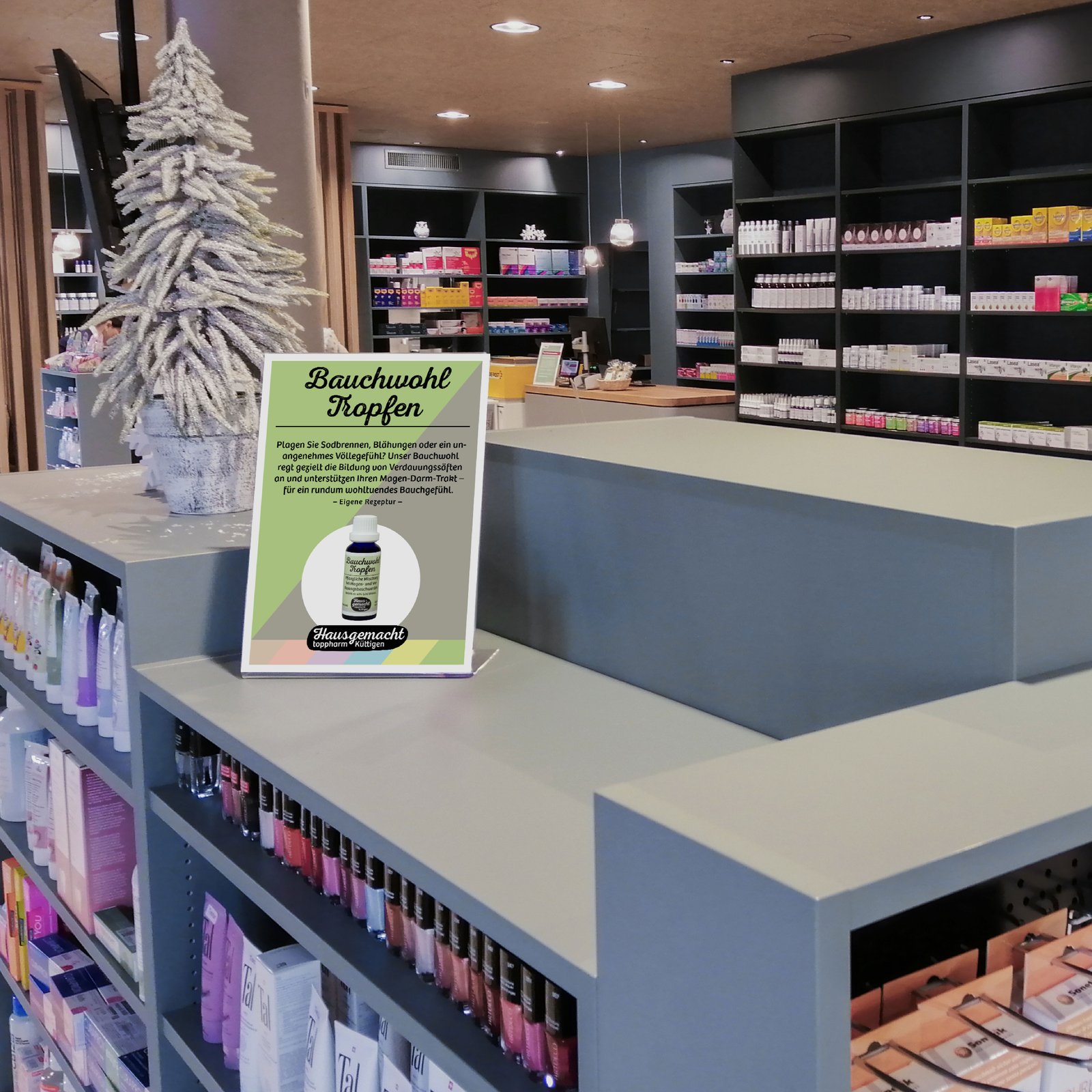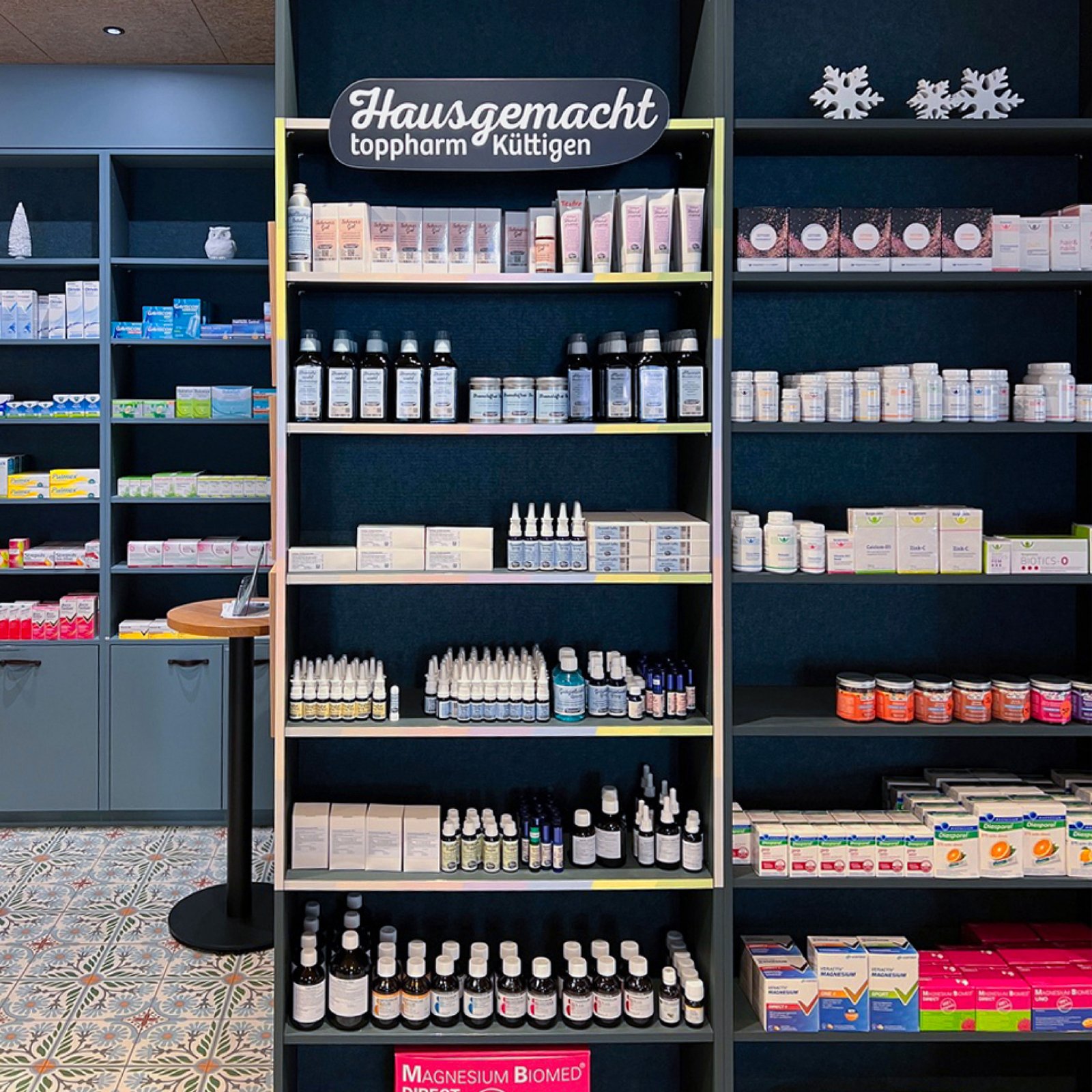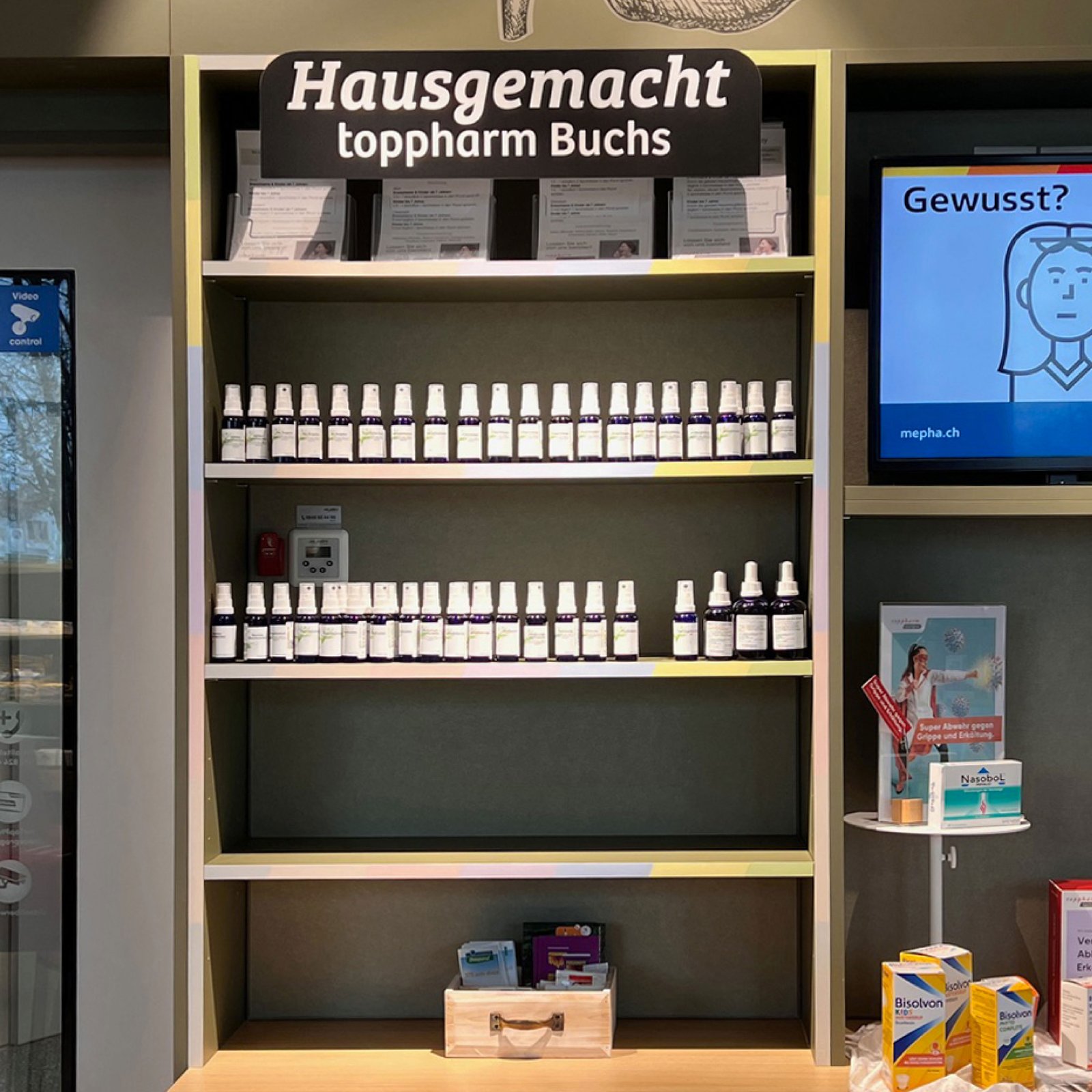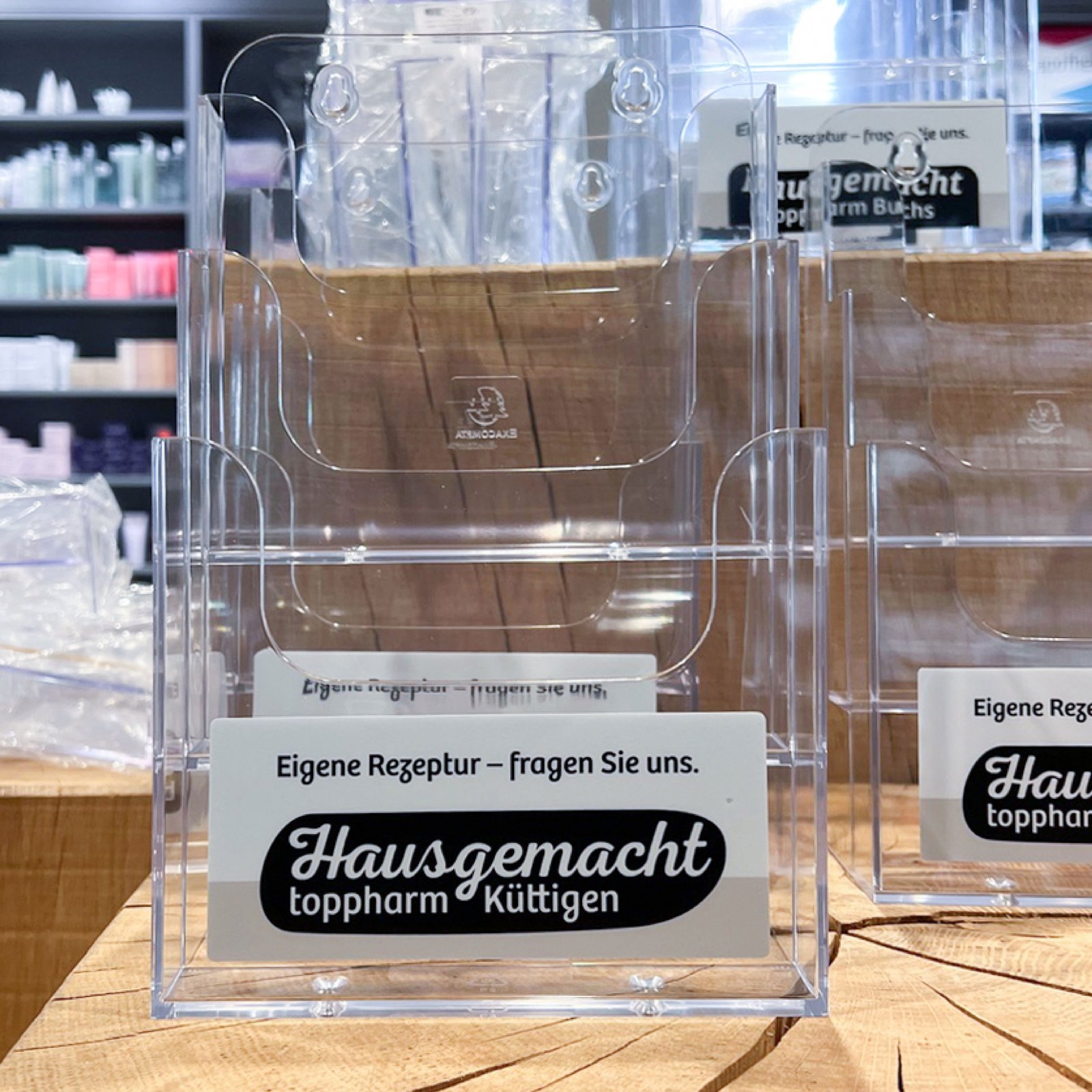 Die Toppharm Apotheken Buchs und Küttigen präsentieren ihre Eigenmarke «Hausgemacht» – für die wir bereits das Packaging sowi die Produktewebsite entwerfen durften – in ihren Filialen in einem neuen, modernen Auftritt. Die Bewerbung erfolgt durch gezielte Maßnahmen: digitale Displays (im Hoch- und Querformat), auffällige A4-Aufsteller und handliche A5-Infoflyer zum Mitnehmen.