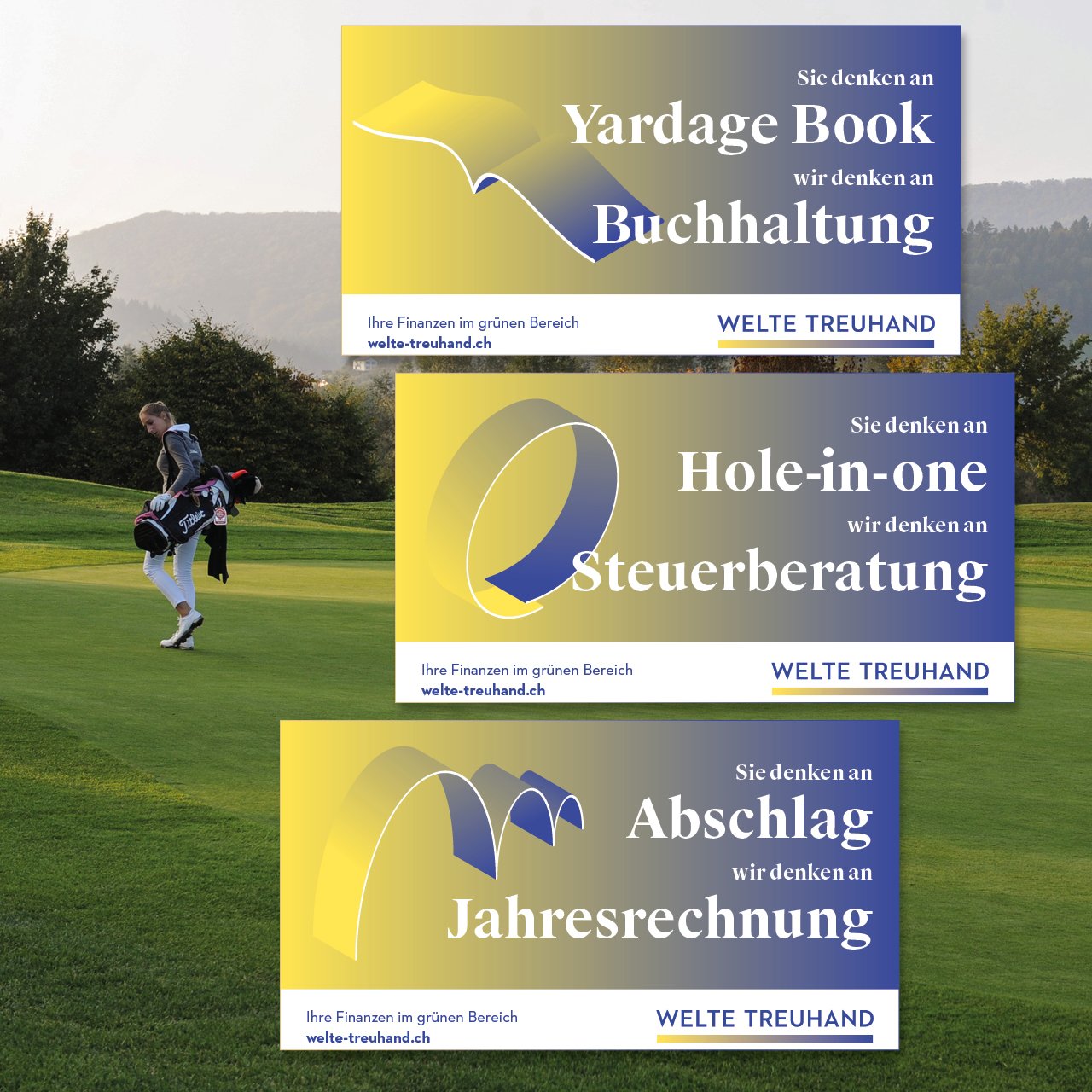 Einige ihrer Klientel spielt gerne Golf; so war es nur logisch, vor Ort potenziellen Kunden die Welte Treuhand schmackhaft zu machen. Dies, indem wir auf der Tea Time Stele mit ausgesuchten Golf-Fachbegriffen den direkten Bezug zu den Welte-Angeboten geknüpft haben.